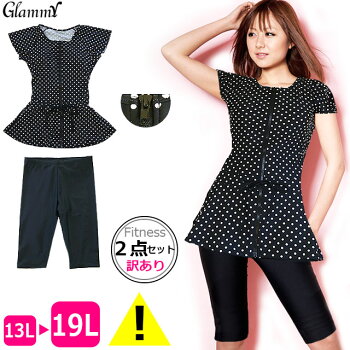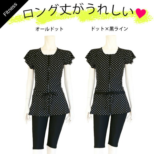 \値下げ/ 訳アリ フィットネス水着 レディース 大きいサイズあり 上下2点セット セパレート ロング丈 チュニック丈 フリル袖 半袖 袖付き 膝上丈スパッツ 体型カバー 水中ウォーキング ドット柄 水玉 プール ジム 耐塩素水 送料無料 COM2/m-f-0038
